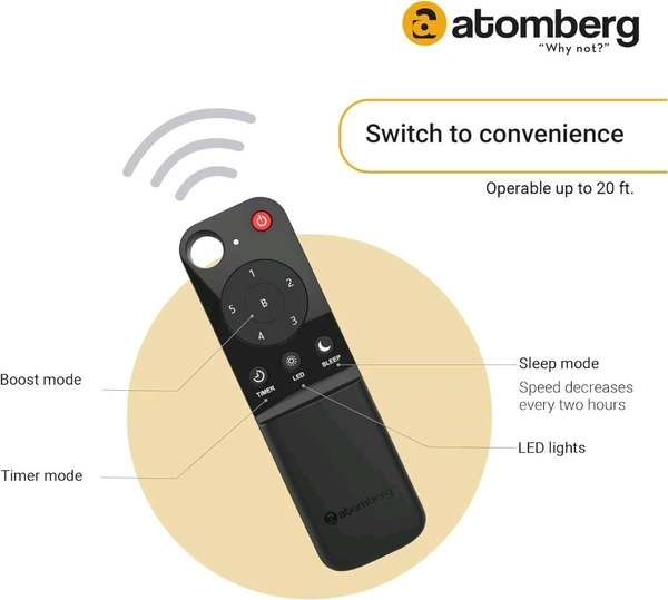 ADDED CONVENIENCE OF REMOTE: Atomberg Renesa Smart+ fan comes with a Smart IR Remote. IR remotes are easy to use without the hassle of pairing. Adjust the fan's speed or activate its unique features like boost mode, timer, or sleep mode at the click of a button.
